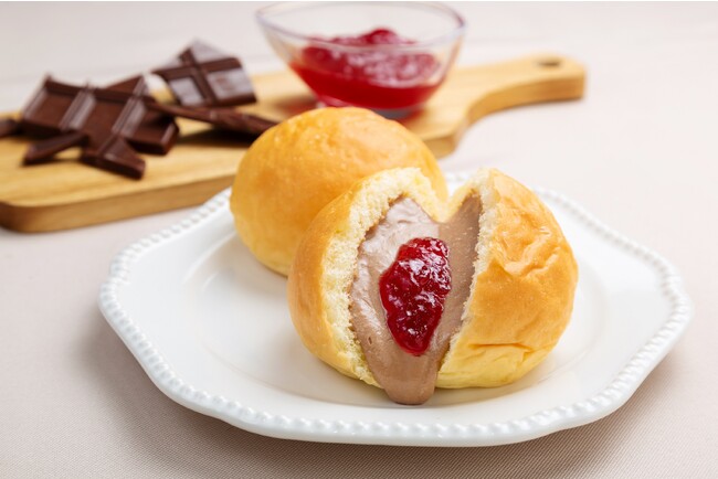 とろけるチョコレートクリームの中に、フランボワーズジャムが入っています。優しい甘さのチョコレートクリームにベリーの香りが広がる風味豊かなくりーむパンです。