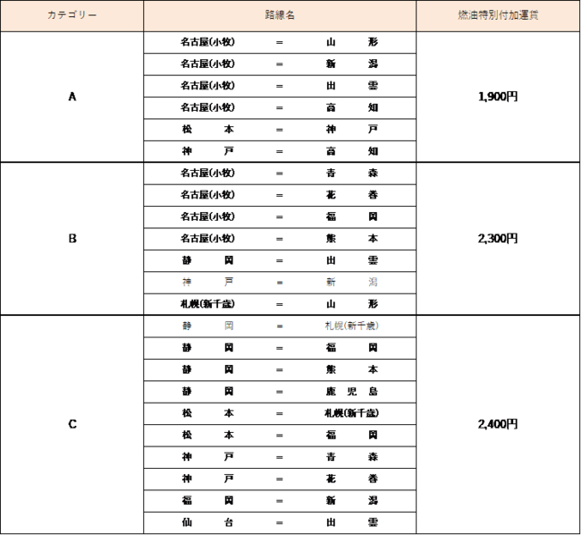 2022年11月発券分につきましては、2022年9月のシンガポールケロシン市況価格平均が1バレル当たり122.7米ドル、為替レートが1米ドル当たり143.1円であったことから、以下の金額を適用させていただきます。