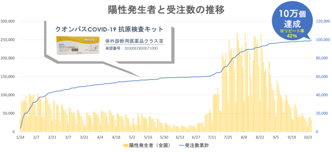 「クオンパスCOVID-19 抗原検査キット」は、提供開始より全国の大手建築会社、金融機関、工場含む1800以上の企業、100を超える自治体、医療機関、介護施設、福祉施設、学校などから幅広い受注を頂き、多数のリピート注文も頂きリピート率は42%となりました。自治体からも全体の15%を超える受注個数をご注文いただき、お役に立てたことをうれしく思っております。提供開始より累計100,000個を超える受注を頂き、数多くのお問い合わせもいただいております。引き続き安心安全な職場環境の整備にお役立ていただければと思います。
