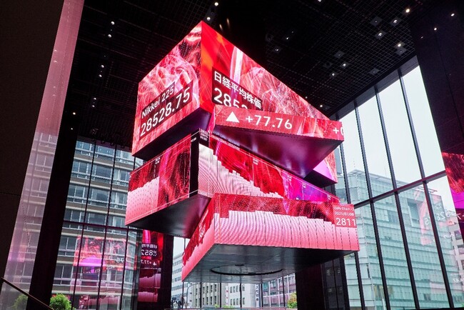 今回受賞した「The HEART」は、日本経済の循環する血流の源として心臓を象徴したデジタルサイネージです。アイコニックなデザインのキューブ型LEDディスプレイ(幅6m、高さ5.5m、奥行き3m)、かつローテーションする分割されたLED機構は世界最大規模となっています。株価データをリアルタイムで処理し心臓をイメージした抽象表現に落とし込んだデータビジュアライゼーションは、株や経済に詳しくない人も日本経済の循環・脈動・熱量を直感的に感じることができるコンテンツとなっています。