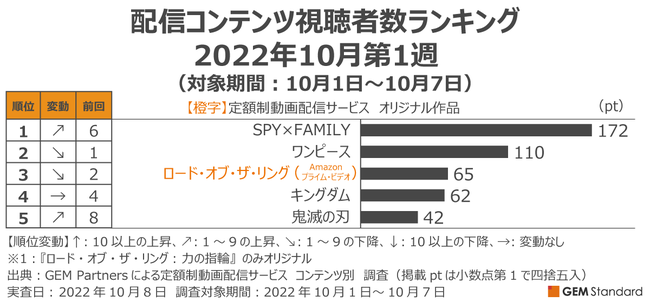 エンタテイメント業界に向けたデータ×デジタルマーケティングサービスを提供するGEM Partners株式会社(ジェムパートナーズ、所在地:東京都港区、代表取締役:梅津文)は10月14日(金)、複数の定額制動画配信サービスを横断して集計した2022年10月第1週の「配信サービス視聴者数ランキング(調査対象期間:10月1日~10月7日、調査対象:日本在住15~69歳男女)」を発表します。