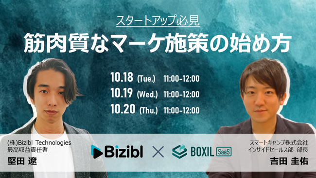 株式会社Bizibl Technologies(本社:大阪市北区、代表取締役:花谷燿平、以下Bizibl)とスマートキャンプ株式会社(本社:東京都港区、代表:古橋 智史、林 詩音、以下スマートキャンプ)が 「スタートアップ必見!!最短経路を行く筋肉質なマーケ施策の始め方」 と題したウェビナーを10月18,19,20日に連日開催いたします。