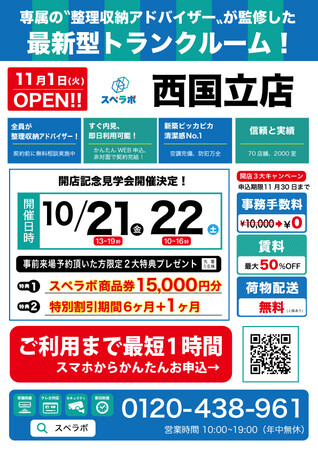 【11月1日(火)オープン】見学から契約、解約まで完全非接触・非対面、お申し込みからご利用まで最短1時間!都内にて絶賛運営中のトランクルーム【スペラボ】が立川市羽衣町に出店!