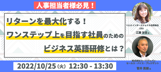 そこで本セミナーでは、大手企業の全社英語化の取り組みの教務中枢として活躍された、Y.E.Dインターナショナル合同会社CEO 江藤 友佳 氏に、最も効率的に効果のある語学研修を実施するには、どういった層に向けて、どんな研修を設計していくべきかをお話しいただきます。