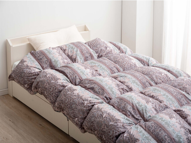 CILシルバーラベルを取得し、ホワイトダックダウン90%使用している羽毛布団です。こちらは立体キルトで縫製しており、布団内部の暖気が逃げにくい構造になっています。一般的に20マスが多い側生地の立体キルト構造を、30マスすることで、しっかり体にフィットし、暖かく快適にお休みいただけます。 こちらは6色、5サイズ展開です。