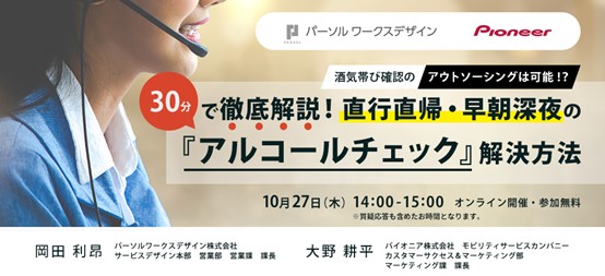 総合人材サービスのパーソルグループで、BPO、ヘルプデスク/コールセンターのアウトソーシングなどを手掛けるパーソルワークスデザイン株式会社(本社:東京都豊島区、代表取締役社長:平林 由義、以下パーソルワークスデザイン)とパイオニア株式会社(本社:東京都文京区、代表取締役兼社長執行役員:矢原 史朗、以下パイオニア)は、10月27日(木)、30分で徹底解説!直行直帰・早朝深夜の「アルコールチェック」解決方法をテーマにについてウェビナーを開催します。