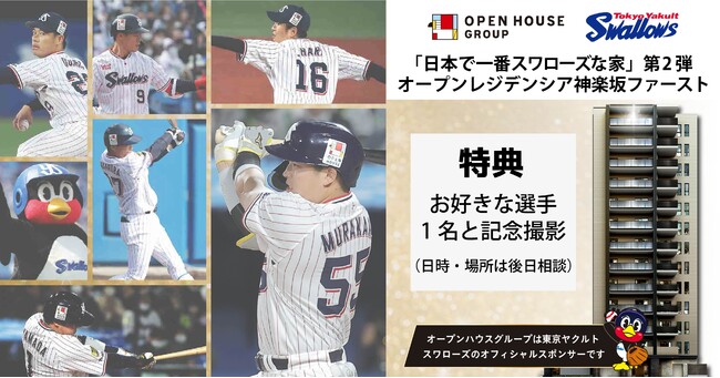株式会社オープンハウスグループ(本社:東京都千代田区、代表取締役社長:荒井 正昭、以下当社)は、東京ヤクルトスワローズ(以下スワローズ)のトップスポンサーとして、この度のクライマックスシリーズ突破を記念して今年も「日本で一番スワローズな家」の実施を発表いたします。昨年ご好評を頂いた企画の第2弾で、今年は特典として「好きな選手1名と記念撮影」をご用意いたしました。