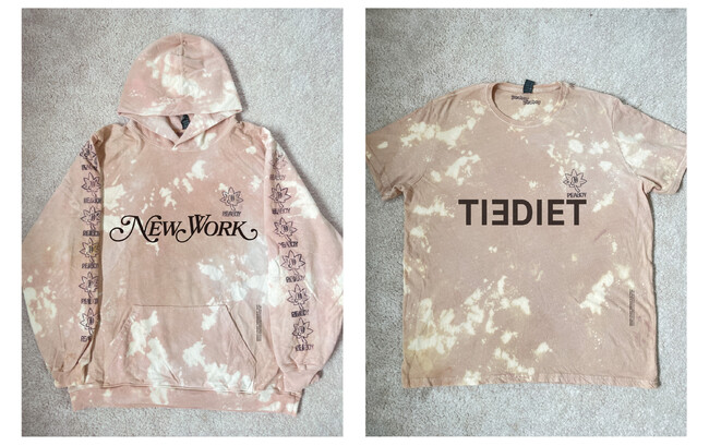 PEABOYと作成したTシャツとフーディは、彼らが住むNYの街中の木漏れ日をイメージしたタイダイ染めが印象的です。