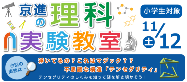 今回の実験では「テンセグリティ」のしくみを知り、その謎を解き明かします。「テンセグリティ」とは「Tension(張力)」と「Integrity(統合)」からなる造語で、この2つの力のバランスによって物が宙に浮いているように見える構造のことを言い、工作でその不思議を体感しながらしくみを理解していきます。小学校1年生の方や初めての方でも安心してご参加いただける内容で、京進の通塾生以外の方も参加が可能です。詳しくはホームページ、またはお近くの京進小中部 各校舎にお問合せください。