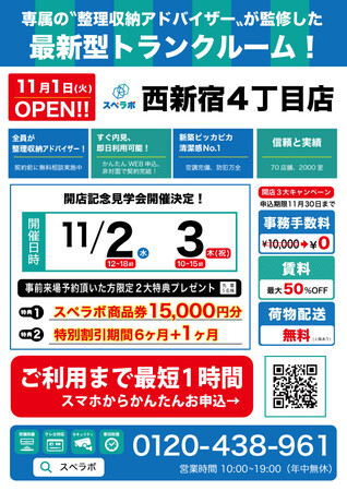 【11月1日(火)オープン】見学から契約、解約まで完全非接触・非対面、お申し込みからご利用まで最短1時間!都内にて絶賛運営中のトランクルーム【スペラボ】が新宿区西新宿に出店!