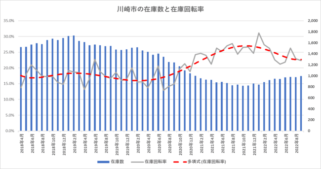 在庫数はいまだ低い水準で推移していますが、増加の傾向がみられます。また、在庫回転率は、東京都23区や横浜市と同様、コロナ禍以前と比較すると現在も高い水準を維持しているものの、在庫数の推移とは逆の動きをしています。従って、現況のように在庫数の増加に伴い、在庫回転率は低下していくことが予想されます。