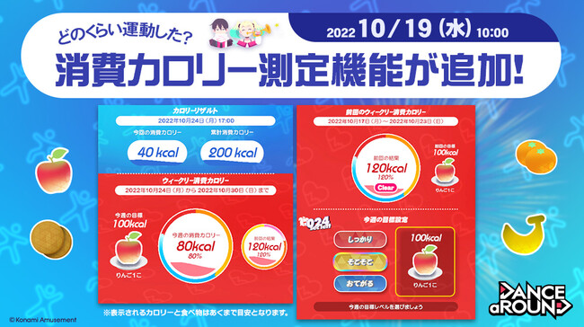 株式会社コナミアミューズメントは、本日10月19日(水)より、最新ダンスゲーム『DANCE aROUND』(ダンスアラウンド)にて消費カロリーが測定できる機能を追加しました。