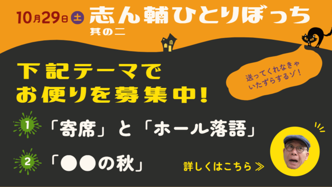 そして、お便りのお題は「○○の秋」と「寄席とホール落語、どっちが好き?」の二つ。皆さんの秋にまつわる話や体験、落語の楽しみ方をお聞かせください。志ん輔さんがラジオのDJ風に紹介します。