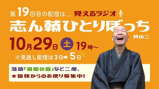毎日新聞社は10月29日(土)午後7時から、第19回オンライン落語会「志ん輔と仲間たち」をインターネットでライブ配信します。演目は「宿屋の富」他一席。今回は「志ん輔ひとりぼっち」として実施し、落語の合間に皆さんからのお便りを紹介します。どしどしお寄せください。