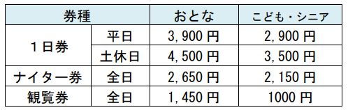 ※1日券は22時まで有効です。ナイターは15時30分以降のご入場になります。