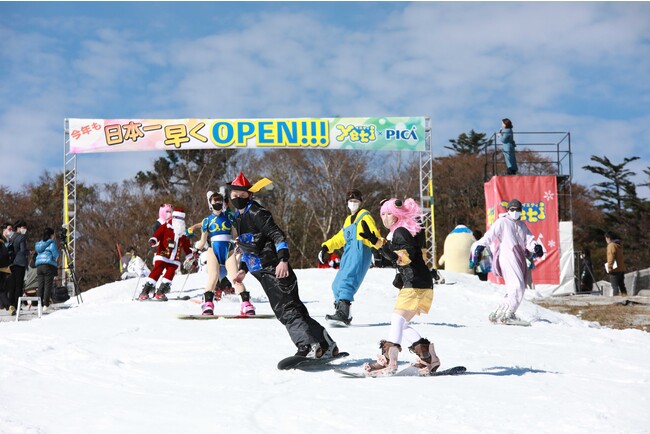 絶好のウィンタースポーツ日和となった、本日午前10時のオープン時、来場したスキーヤー、スノーボーダーは約400人。感染症対策のためMCの掛け声とご来場者の“心の声”によるカウントダウンでゲレンデがオープン。色とりどりの衣装に仮装したスキーヤーやスノーボーダーが順番に滑り出し、スノーシーズンの開幕を華やかにお祝いしました。今シーズンの一番乗りのお客様は、新潟県からお越しの男性で、「昨年は参加できませんでしたが、オープン日は10回目の参加となります!今年も楽しみます!」とコメントしていました。