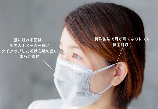 直接素肌に触れる面には柔らかい質感で通気性の良い素材を使用、耳ひもは特殊製法で編み込んでおり長時間着用しても耳が痛くなりにくい出来上がりとなっております。