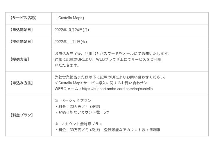 三井住友カード株式会社(本社:東京都江東区、代表取締役社長:大西 幸彦、以下「三井住友カード」)は、11月1日より、消費分析地図サービス「Custella Maps(カステラ マップス)」の提供を新たに開始いたします。キャッシュレスデータの特徴である正確な属性や購買データをもとに、商圏を可視化した地図情報サービスを提供することで、商圏における顧客理解や出店戦略など企業のマーケティング課題の解決をサポートします。