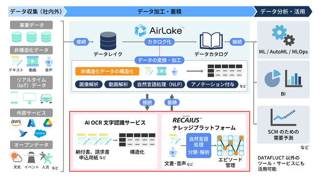 データサイエンスで企業と社会の課題を解決する株式会社DATAFLUCT(本社所在地:東京都渋谷区、代表取締役CEO:久米村 隼人、以下DATAFLUCT)は、社内外の様々なデータの集約や非構造化データの構造化[※1]に強みをもつ当社のノーコードクラウドデータプラットフォーム「AirLake(エアーレイク)[※2]」と、東芝デジタルソリューションズ株式会社(本社:神奈川県川崎市、取締役社長:岡田 俊輔、以下東芝デジタルソリューションズ)が提供する「AI OCR文字認識サービス[※3]」および「RECAIUS(リカイアス)ナレッジプラットフォーム[※4]」との連携を、本日から開始します。