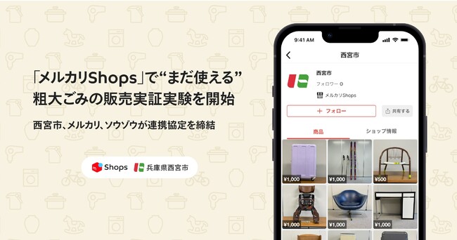 また、本日より西宮市民が排出する一般・粗大ごみのうち、再利用可能なものや、市民がリユースを希望して持ち込んだ不要品を西宮市が「メルカリShops」を用いて販売する実証実験を開始いたします。なお、自治体がまだ使える粗大ごみを「メルカリShops」上で販売することは全国で3例目であり、西日本エリアでは初の取り組みです。