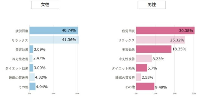 水風呂に入る理由としては全体・男女別ともに疲労回復・リラックスが1位・2位となりました。 美容効果としては男女で差が大きく、男性はたったの3%でしたが、女性は18%と、美容目的として入るひとも一定数いることがわかりました。