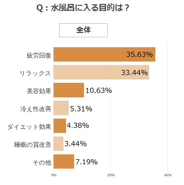 水風呂には自律神経を整える効果があるため、睡眠の質改善にも繋がるのですが、その点はあまり知られていないのか、睡眠の質改善を目的として入るひとは全体でも3%と、非常に少ない結果となりました。