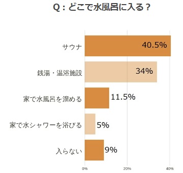 水風呂に入る場所・場面としては、サウナがトップで40%。やはりサウナとセットで入るという人が多いようですね。 ただサウナに続く銭湯・温浴施設も34%ということでサウナとそれほど開きがありません。 家で水風呂を溜める、または家で水シャワーを浴びる、というひとも合わせて16%いて、一部の人は家で水風呂を行っているということがわかりました。