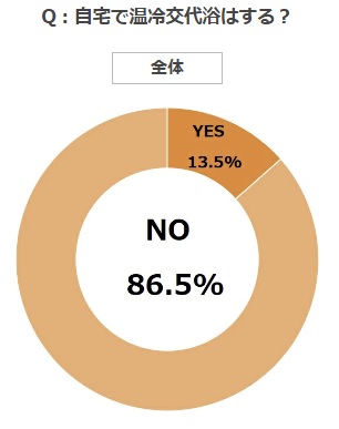 自宅での温冷交代浴実践の有無については、圧倒的にしていないという人が多く、全体ではしている人は13%、男女別に見て男性17%・女性約10%で男性のが若干高いという結果に。 浴槽が2つあるというご自宅はそうそうないかと思いますので、お湯を溜めた浴槽+冷たいシャワーを使い、無理のない範囲で実践してみましょう。