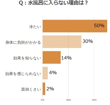 普段水風呂に入らないという人の理由を質問したところ、圧倒的に多いのが“冷たい”の50%。 確かに慣れていない場合や初めて入る場合などは冷たくてわざわざ入りたくないと思ってしまうかもしれません。