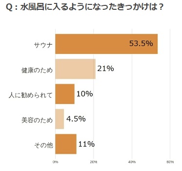 水風呂に入るようになったきっかけとしては、圧倒的に“サウナ”が多く、半数以上という結果に。 続いて“健康のため”という人が2割以上ということで、健康のために意識的に始めたというひとも一定数いることがわかりました。