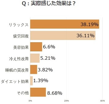 実際に感じた効果はリラックス・疲労回復と続き、多くの人が主に目的としている効果はしっかりと得られているということがわかりました。 一方美容効果やダイエット効果に関しては、実際にはあまり感じられていないということがわかりました。
