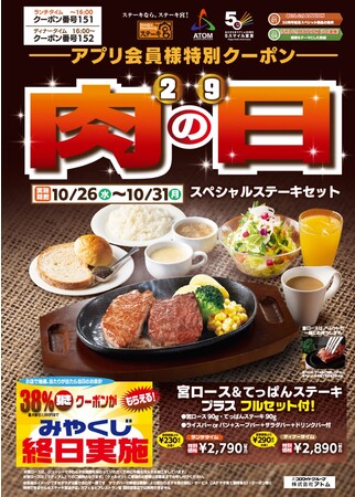 コロワイドグループの株式会社アトム(本社:神奈川県横浜市、代表取締役社長:山角豪)は、「ステーキ宮」各店で、2022年10月26日(水)から、2022年10月31日(月)までの6日間、「肉の日スペシャルステーキセット」をアプリ会員とTwitterフォロワー限定で販売いたします。