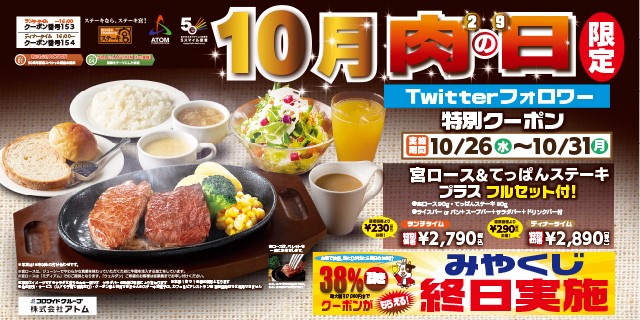~食欲の秋!食欲旺盛なこの時期においしいステーキはいかが? ~ 肉の日スペシャルステーキセットアプリ会員とTwitterフォロワー限定お得なクーポンプレゼント!