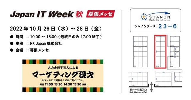 株式会社シャノン(本社:東京都港区、代表取締役社長:中村 健一郎、証券コード:3976、以下シャノン) は、2022年10月26日(水)~28日(金)に幕張メッセで開催される「第13回 Japan IT Week 秋」(以下IT Week)へ出展し、スペシャルコンテンツとしてブース内で人力舎若手芸人による「マーケティング漫才」を披露いたします。