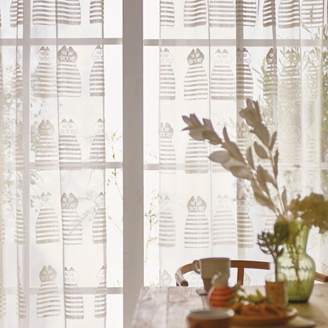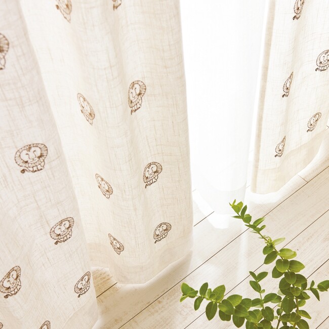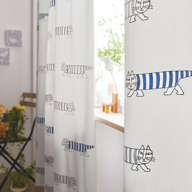 リサ・ラーソンの作品に漂うちょっぴりユーモラスで人間味あふれる世界観を表現するために、どんな素材を使うのか、どんな手法を取り入れたらいいのか、たくさんたくさん時間をかけて、一生懸命考えました。そして生まれたのが、あたたかみのあるやさしい手ざわりと、天然素材が持つ味わいと風合いのあるカーテンです。さらに日本の高い技術を生かして一針一針ていねいに刺繍を施す手法も一部に採り入れ、愛らしいキャラクターたちをより魅力的に描き出しました。こだわりをさりげなく盛り込んだ「リサ・ラーソン」のカーテンコレクション。ほっこり心が癒される素朴でナチュラルな空間をお楽しみください。
