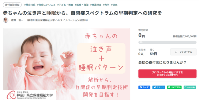 今回のクラウドファンディングを通じ、赤ちゃんの声を解析できる人材を雇用するための研究資金を確保するとともに、多くの皆様にプロジェクトを知っていただき、自閉症スペクトラムに対する理解を広めていきたいと考えております。