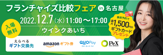 株式会社じげん(本社:東京都港区、代表取締役 社長執行役員CEO:平尾丈、東証プライム:3679、以下じげん)が運営するフランチャイズ情報サービス「フランチャイズ比較.net」 https://www.fc-hikaku.net/ は、2022年12月7日(水)にウインク愛知にて、有力フランチャイズ・専門家が一堂に集結する「フランチャイズ比較フェアin名古屋」を開催します。