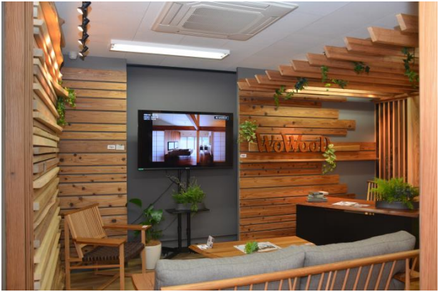 働き方改革の推進により、働き方の多様化とともに生産性の向上や働く人々の健康配慮が重要視され、オフィス空間の木質化へのニーズが高まる中、「木フェス(R)」では、事務所棟内の会議室にオフィスの木質空間を想定した「WoWooD™」ブースを設けました。