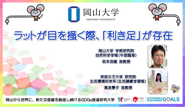 国立大学法人岡山大学(本部:岡山市北区、学長:槇野博史)の学術研究院自然科学学域(牛窓臨海)の坂本浩隆准教授(神経内分泌学)と、奈良女子大学研究院生活環境科学系(生活健康学領域)の高浪景子准教授(行動神経科学)(前・国立遺伝学研究所 助教)の研究グループは、ラットにおいてヒスタミンで両目を刺激した場合、目を掻くのは主に右の後足であること(すなわち、ラットが目を掻く際の「利き足」)を発見しました。さらに、近年マウス脊髄でガストリン放出ペプチド(GRP)受容体という神経ペプチドの受容体が「かゆみ特異的伝達分子」として機能していることが報告されていました。