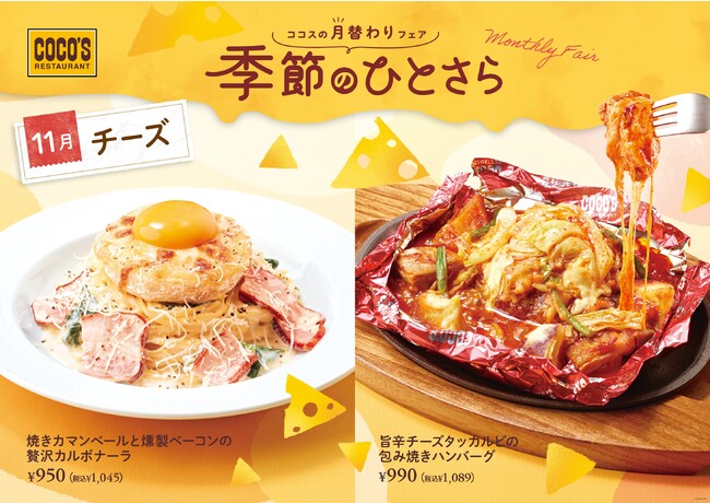 11月は、肌寒くなる季節にぴったりの、“チーズ”を使用した2品をご用意しました。香り高い燻製ベーコンを使用したカルボナーラは、こんがり焼き上げたカマンベールチーズを豪快に盛り付けた、見た目も大胆な一品です。チーズタッカルビ風に仕上げたココス定番の包み焼きハンバーグは、とろ~り伸びるチーズをチキンやさつまいもなどたっぷりの具材と一緒にお楽しみいただけます。