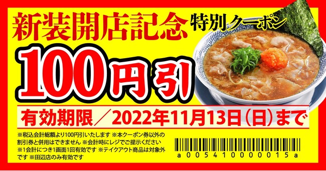 リニューアル記念として、2022年11月13日(日)まで『丸源ラーメン 田辺店』のみでご利用いただける100円引クーポンを配布します。