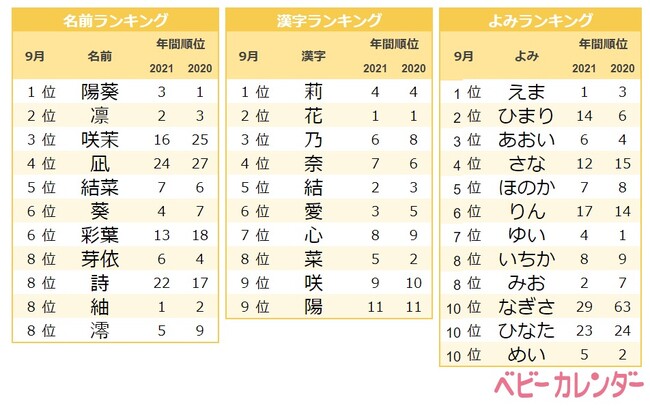また、9月の風物詩「十五夜」(月見)にちなんでか、「月」を用いた名前も増加。13位「結月(ゆづき)」・「葉月(はづき)」、30位「菜月(なつき)」、42位「美月(みつき、みづき)」、54位「優月(ゆづき)」などが人気でした。「月」は漢字ランキングで8月18位(121名)から、9月15位(166名)へランクアップし、45名増加していました。