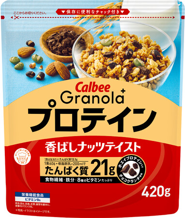 ●『Granola+ プロテイン』は香ばしナッツテイストのグラノーラです。黒大豆や青大豆、クラッシュアーモンド、ホエイプロテイン入りのチョコクランチをトッピング。1食分(60g)+低脂肪乳(※2)200mlで、たんぱく質21gを摂取できます。