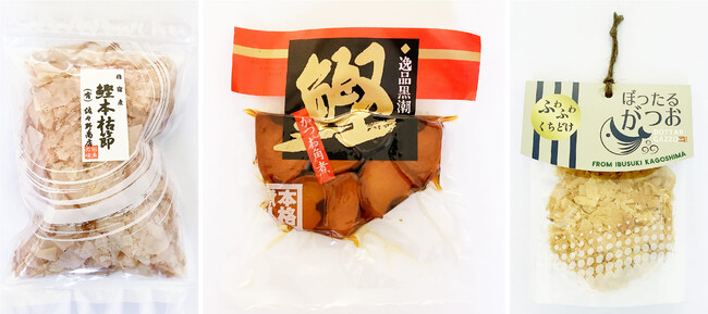 左:(有)佐々野商店 鰹本枯節 中:(株)協栄鰹節 かつお角煮 右:(株)カネニニシ ぼったるがつお
