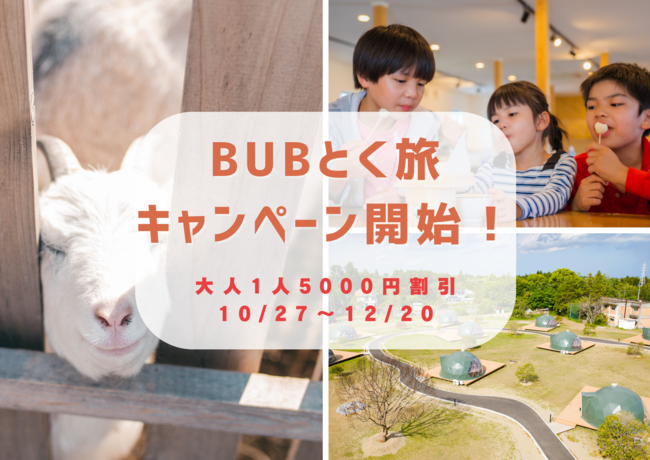 観光庁主導で、旅行の再開など観光需要の喚起を目的にした、全国旅行支援において、千葉では「千葉とく旅キャンペーン全国版」が実施されております。各事業者に割り当てられる補助予算の上限に達し、キャンペーンは終了となりましたが、お客様に安全な旅行と、BUB RESORTでの体験を楽しんでいただきたいと考え、オリジナルの「BUBとく旅キャンペーン」を期間限定で開始いたします。