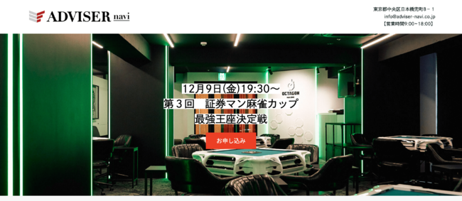 アドバイザーナビ株式会社(所在地:中央区日本橋、代表取締役:平 行秀、以下弊社)主催、株式会社シン・オクタゴン(本社:東京都渋谷区、代表取締役社長:武田 丈宏、以下「シン・オクタゴン」)(サイバーエージェントグループ)協力のもと「第3回 証券マン麻雀カップ 最強王座決定戦」の開催が決定いたしました。