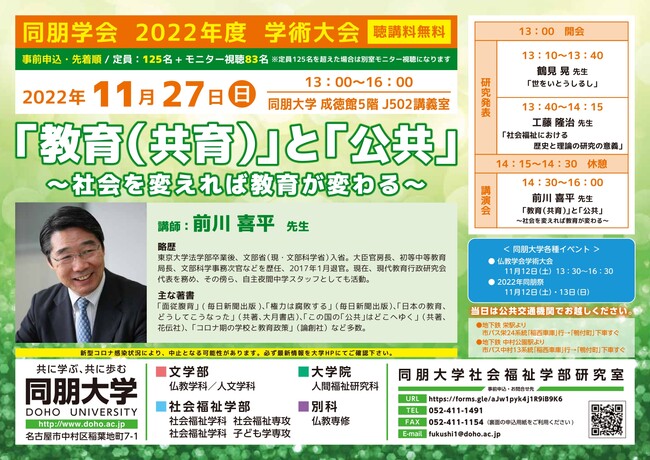 同朋大学 教授による研究発表や、元文部科学事務次官の前川 喜平 氏による講演会を予定。聴講料無料、事前申込制です。