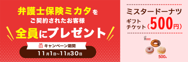 対象期間中に弁護士保険STATION経由で、ミカタ少額短期保険株式会社「弁護士保険ミカタ」の契約申込を完了し、ご契約が成立されたお客様全員に、「ミスタードーナツ ギフトチケット(500円)」をプレゼントします。
