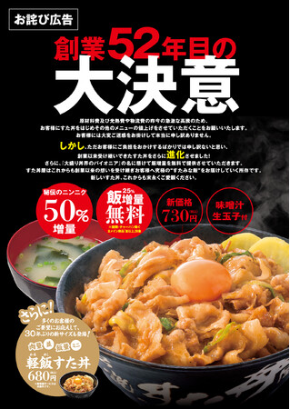 しかし、ただお客様にご負担をおかけするばかりでは申し訳ないと思い、創業以来受け継いできたすた丼をさらに進化させました。試作・試食を重ね品質の維持・向上を図るため、すた丼のニンニク量を50%増量し、これまで以上にニンニクの香りが口に広がる丼に仕上げました。