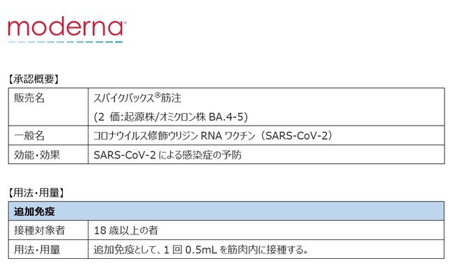 モデルナ、オミクロン株BA.4-5対応の追加接種用2価ワクチン「スパイクバックス(R)筋注」(2 価:起源株/オミクロン株BA.4-5)の一部変更承認を取得